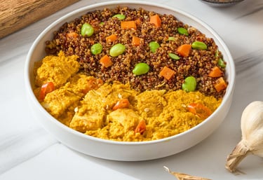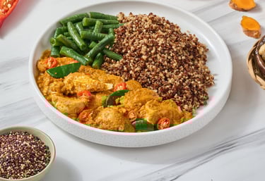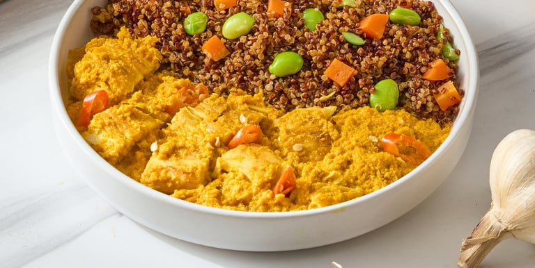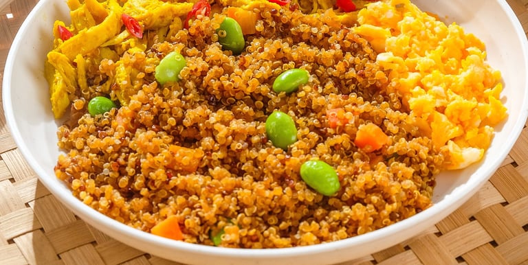 Quinoa tapi ala nasgor tek-tek yang smoky dengan topping ayam bumbu kuning. High Protein dan guilt free