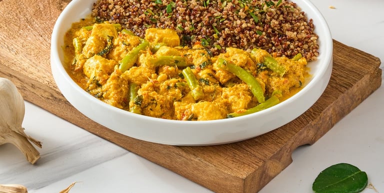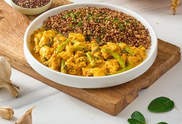 Quinoa daun jeruk disajikan dengan ayam woku Manado yang nendang. Cocok buat pecinta pedas!