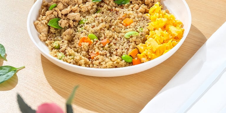 Nasi goreng quinoa dengan ayam Thai basil yang juicy dan aromatik. Comforting dan high protein